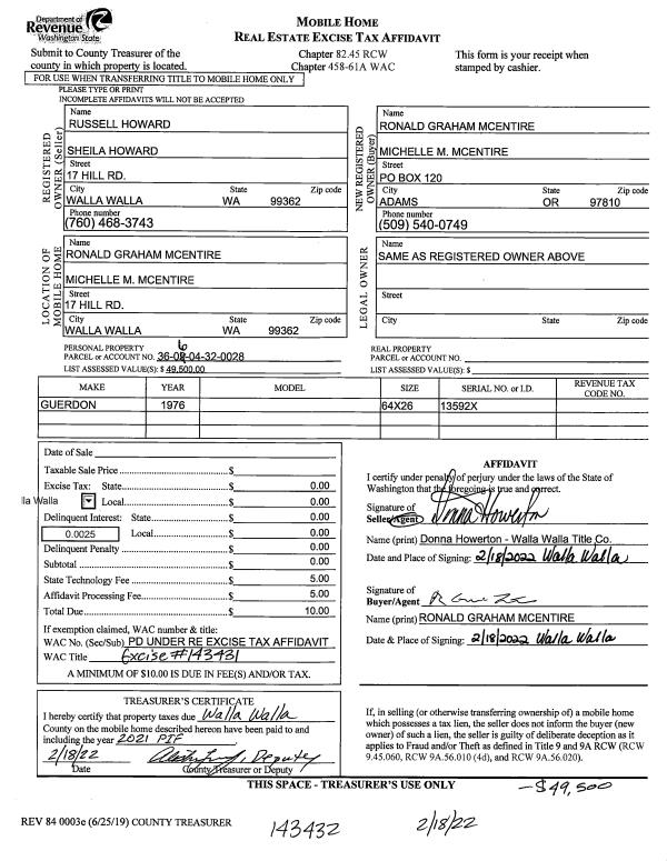 | 3 | 02/18/2022 | MH AFFIDAV | MOBILE HOME AFFIDAVIT | HOWARD SHEILA COLLEEN | MCENTIRE RONALD GRAHAM & MICHELLE M | | | | 143432 | MHAFF-143432 |