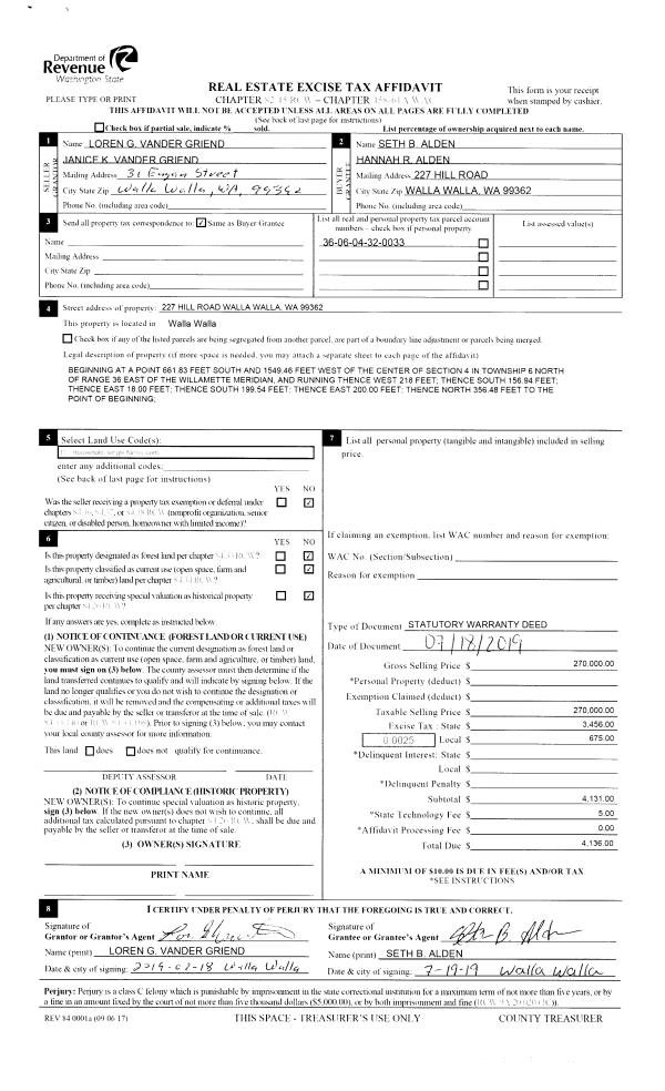 | 1 | 07/19/2019 | SWD | STATUTORY WARRANTY DEED | VANDERGRIEND LOREN G & JANICE | ALDEN SETH B & HANNAH R | | | $270,000.00 | 137319 | 2019-05260 |