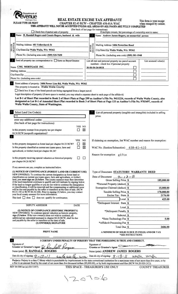 | 2 | 09/16/2011 | WARRANTY D | WARRANTY DEED | ROGERS, H RANDALL & CONNIE A | ROGERS, ANDREW JAMES | | | $185,000.00 | 120706 | 2011-07246 |