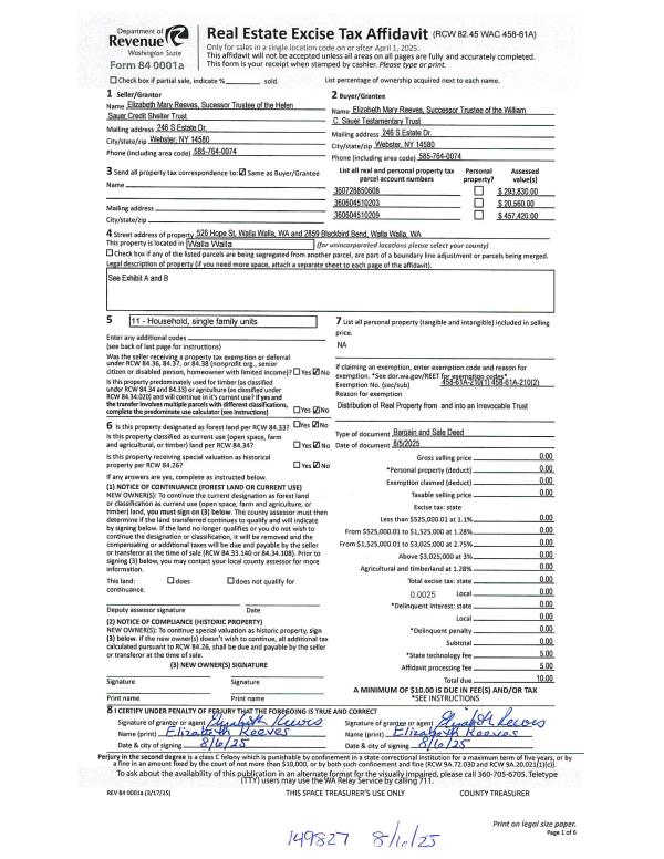 | 1 | 08/06/2025 | BARGAIN & | BARGAIN & SALE DEED | SAUER HELEN RESIDUARY CREDIT SHELTER TRUST | SAUER WILLIAM C TESTAMENTARY TRUST | | | | 149827 | 2025-04646 |