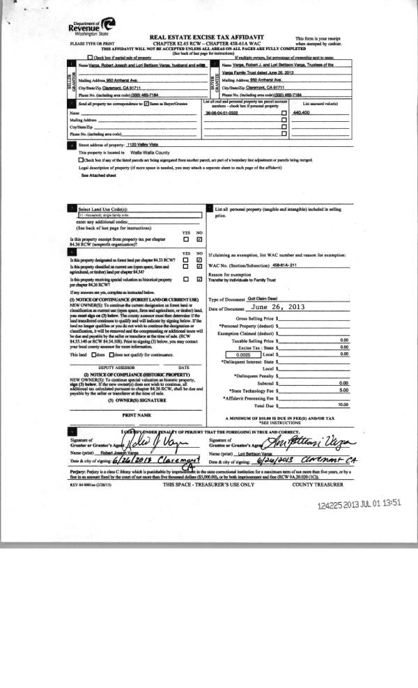 | 2 | 07/01/2013 | QCD | QUIT CLAIM DEED | VARGA, ROBERT J & LORI B | VARGA FAMILY TRUST | | | $0.00 | 124225 | 2013-06573 |