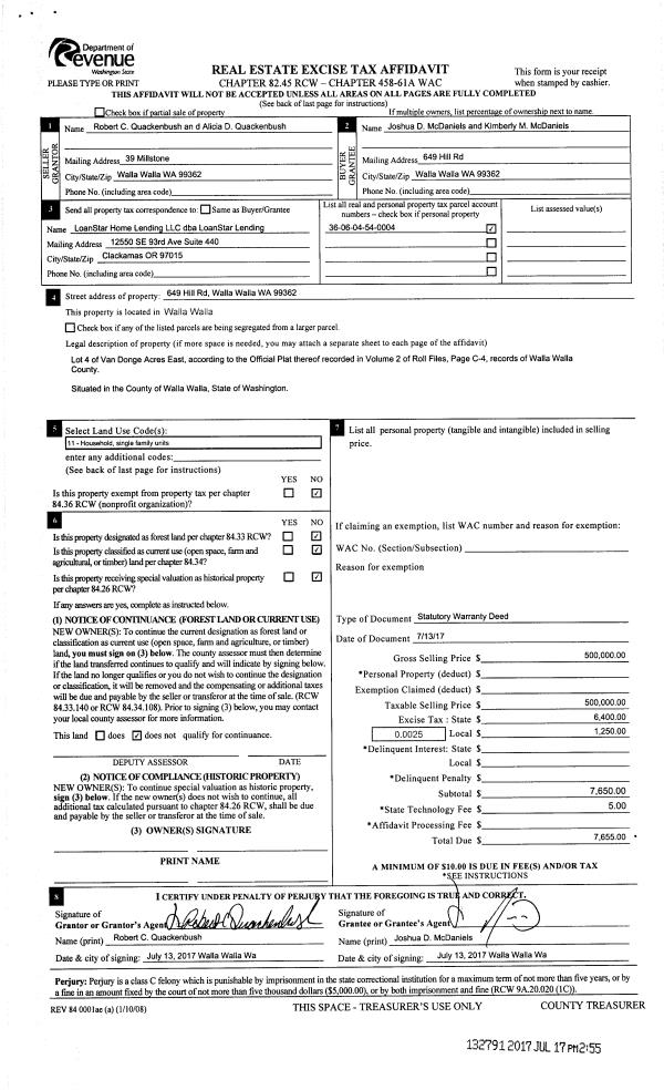 | 1 | 07/17/2017 | SWD | STATUTORY WARRANTY DEED | QUACKENBUSH ROBERT C & ALICIA D | MCDANIELS JOSHUA D & KIMBERLY M | | | $500,000.00 | 132791 | 2017-05473 |