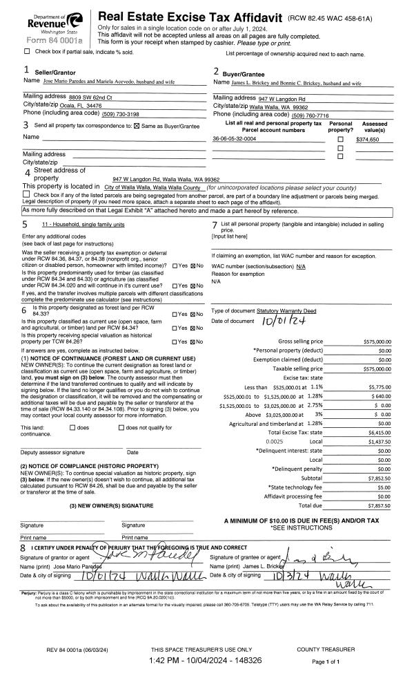 | 1 | 10/04/2024 | SWD | STATUTORY WARRANTY DEED | PAREDES JOSE MARIO & MARIELA ACEVEDO | BRICKEY JAMES L & BONNIE C | | | $575,000.00 | 148326 | 2024-05800 |