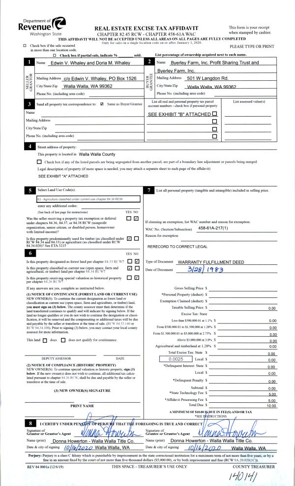 | 2 | 10/19/2020 | WARRANTY D | WARRANTY DEED | WHALEY EDWIN V | BYERLEY FARM INC | | | | 140141 | 2020-10871 |