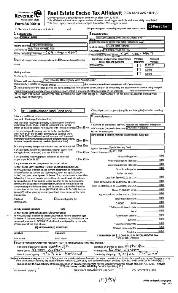 | 1 | 05/19/2022 | SWP | Special Warranty Deed | BUTTICE MICHAEL D | MICHAEL & JENNIFER BUTTICE TRUST | | | $0.00 | 143974 | 2022-04279 |