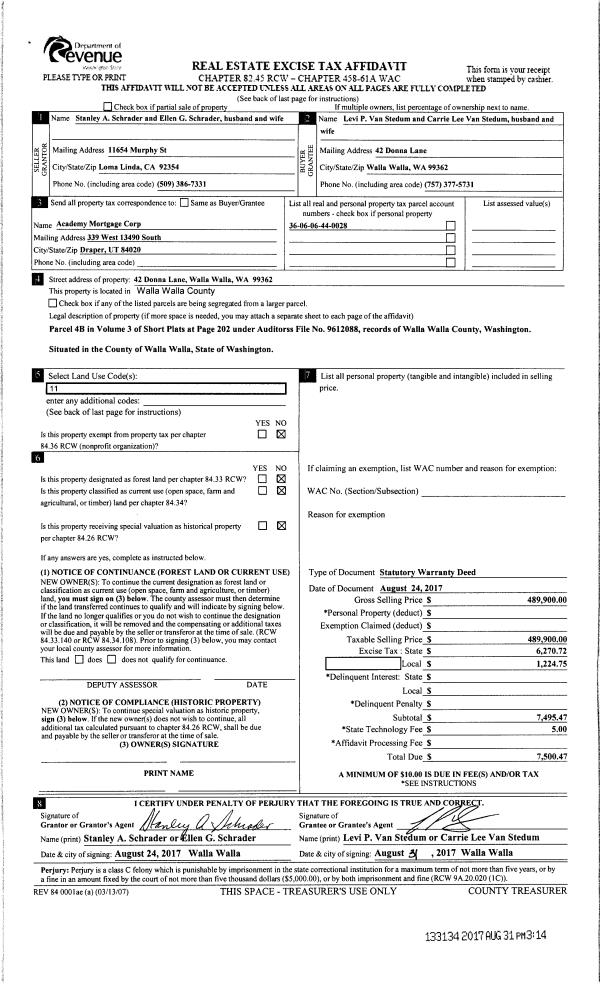 | 1 | 08/31/2017 | SWD | STATUTORY WARRANTY DEED | SCHRADER STAN A & ELLEN G | VAN STEDUM LEVI & CARRIE | | | $489,900.00 | 133134 | 2017-06864 |