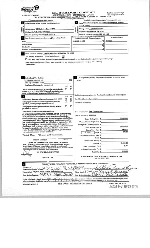 | 5 | 09/29/2014 | REAL ESTAT | REAL ESTATE CONTRACT | WADE FAMILY TRUST | SPEARS WILLIAM RUSSELL & KRISTINA FAUVER | | | $350,000.00 | 126722 | 2014-07131 |