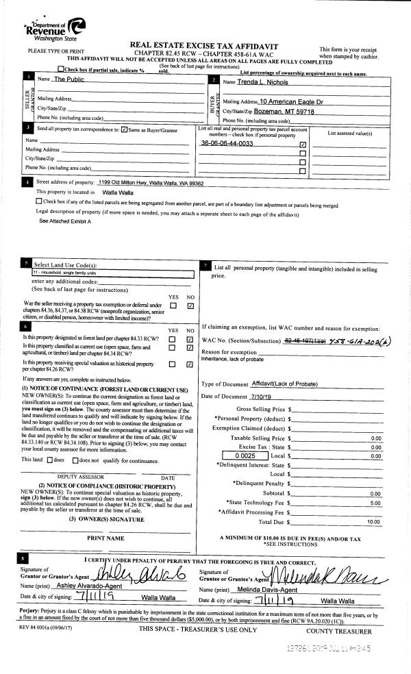 | 2 | 07/11/2019 | LOPA | LACK OF PROBATE AFFIDAVIT | NICHOLS ALAN C & TRENDA L | NICHOLS TRENDA L | | | $0.00 | 137261 | 2019-04959 |