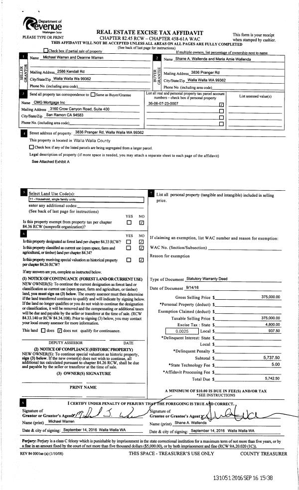 | 1 | 09/16/2016 | SWD | STATUTORY WARRANTY DEED | WARREN MICHAEL & DEANNE | WALLENDA SHANE A & MARIA AIMEE L | | | $375,000.00 | 131051 | 2016-07566 |