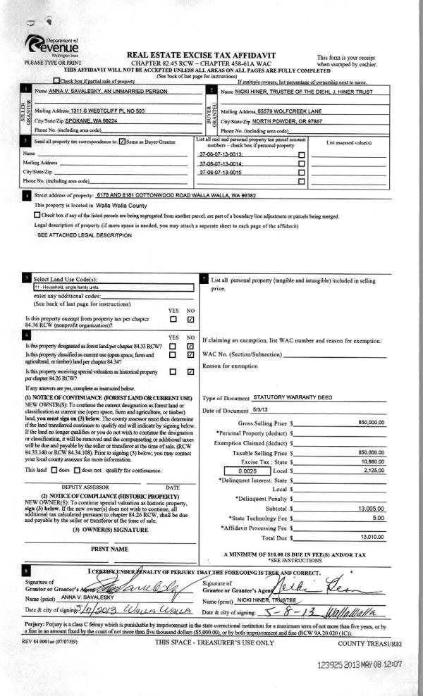 | 6 | 05/08/2013 | WARRANTY D | WARRANTY DEED | SAVELESKY ANNA | HINER NICKI | 3-PARCELS | | $850,000.00 | 123925 | 2013-04576 |