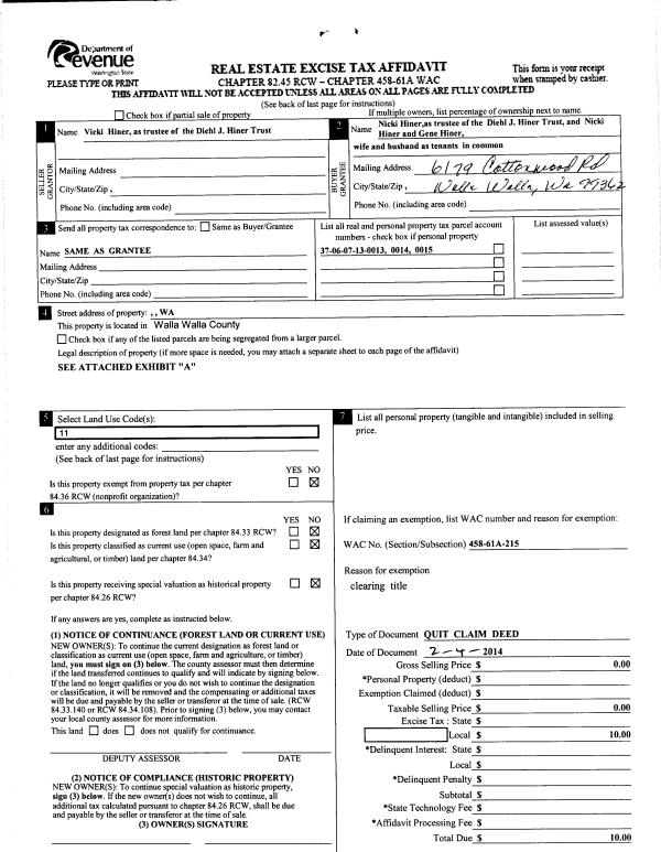 | 5 | 02/05/2014 | QCD | QUIT CLAIM DEED | HINER NICKI | THE DIEHL J HINER TRUST | 3 PARCELS | | | 125389 | 2014-00901 |