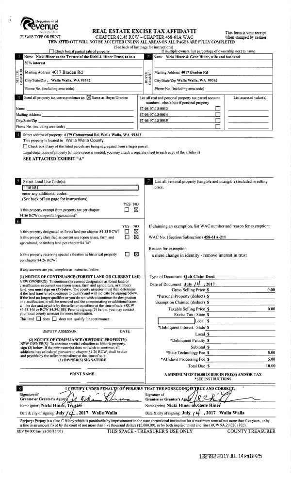 | 4 | 07/14/2017 | QCD | QUIT CLAIM DEED | THE DIEHL J HINER TRUST | HINER GENE & NICKI | | | $0.00 | 132782 | 2017-05391 |