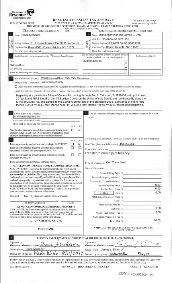 | 1 | 08/11/2017 | QCD | QUIT CLAIM DEED | MICHENER DIANA | DINE JAMES L | | | $0.00 | 132983 | 2017-06203 |