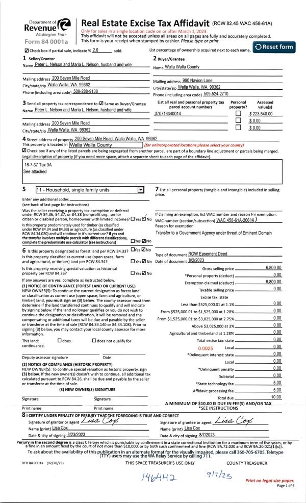 | 1 | 09/07/2023 | EASE | EASEMENT | NELSON PETER L & MARIA L | WALLA WALLA COUNTY OF | | | $6,800.00 | 146442 | 2023-05215 |