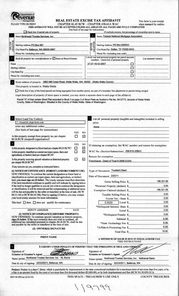 | 5 | 02/28/2011 | WARRANTY D | WARRANTY DEED | NORTHWEST TRUSTEE SERVICES INC | FEDERAL NATIONAL MORTGAGE~ASSO | | | $186,321.00 | 119799 | 2011-01839 |