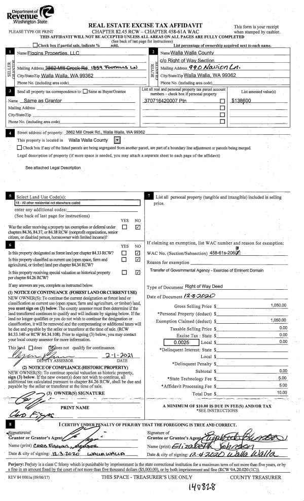 | 2 | 02/01/2021 | EASE | EASEMENT | FIGGINS PROPERTIES LLC | WALLA WALLA COUNTY | | | $1,050.00 | 140828 | 2021-01206 |