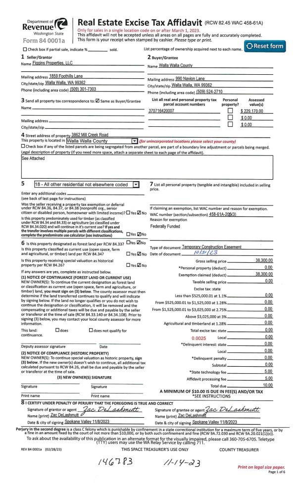 | 1 | 11/14/2023 | EASE | EASEMENT | FIGGINS PROPERTIES LLC | WALLA WALLA COUNTY OF | | | $178,000.00 | 146782 | 2023-06649 |