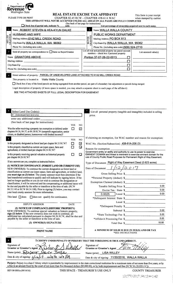 | 4 | 01/13/2017 | EASE | EASEMENT | DALKE ROBERT STEVEN & HEA-KYUNG | WALLA WALLA COUNTY OF | | | | 131770 | 2017-00360 |