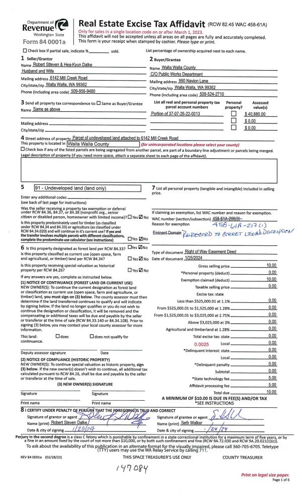 | 3 | 01/30/2024 | EASE | EASEMENT | DALKE ROBERT STEVEN & HEA-KYUNG | WALLA WALLA COUNTY OF | | | | 147084 | 2024-00484 |