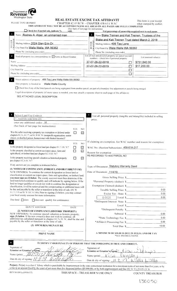 | 1 | 11/08/2019 | SWD | STATUTORY WARRANTY DEED | ALGER RODNEY A | BLAKE & KATI TREINEN TRUST | | 2-PARCLES | $1,040,000.00 | 138046 | 2019-09160 |