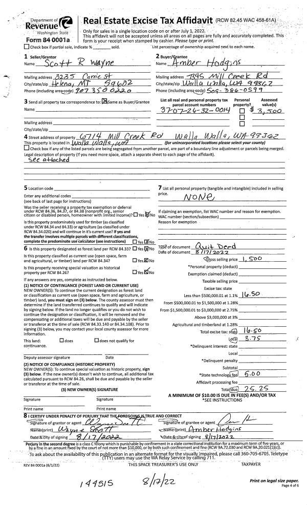 | 1 | 08/17/2022 | QCD | QUIT CLAIM DEED | SCOTT WAYNE R | HODGINS AMBER RL | | | $1,500.00 | 144515 | 2022-06886 |
