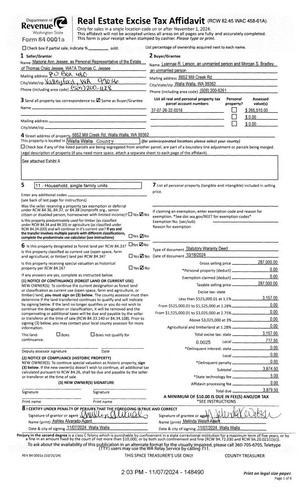 | 1 | 11/07/2024 | SWD | STATUTORY WARRANTY DEED | JESSEE THOMAS C | LARSON LYANNAE R | | | $287,000.00 | 148490 | 2024-06513 |