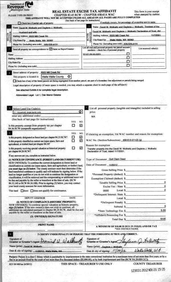 | 5 | 11/20/2012 | QCD | QUIT CLAIM DEED | WOLKWITZ, DAVID W & GAYLENE J | WOLKWITZ, DAVID W & GAYLENE J | | | $0.00 | 123031 | 2012-10347 |
