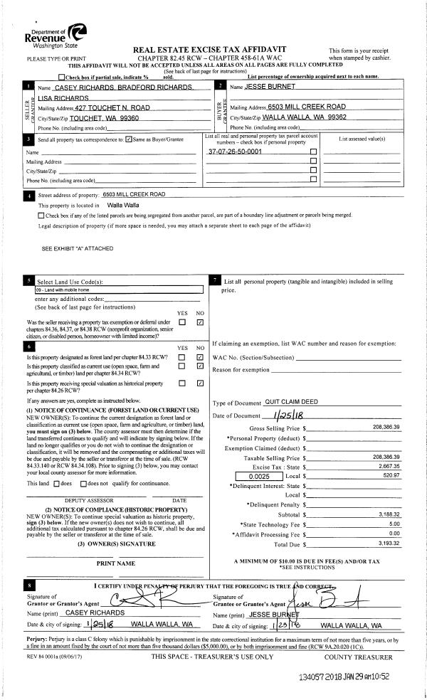 | 1 | 01/29/2018 | QCD | QUIT CLAIM DEED | RICHARDS CASEY & JESSE BURNET | BURNET JESSE | | | $208,386.00 | 134057 | 2018-00788 |