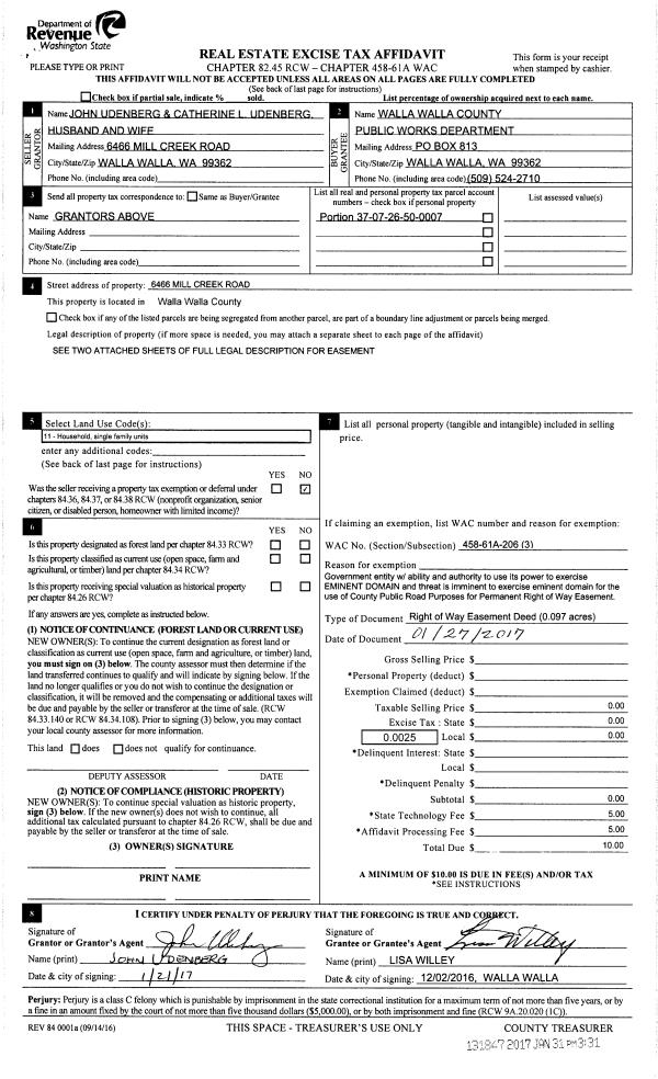 | 1 | 02/07/2017 | EASE | EASEMENT | UDENBERG JOHN & CATHERINE | WALLA WALLA COUNTY OF | | | | 131847 | 2017-00856 |