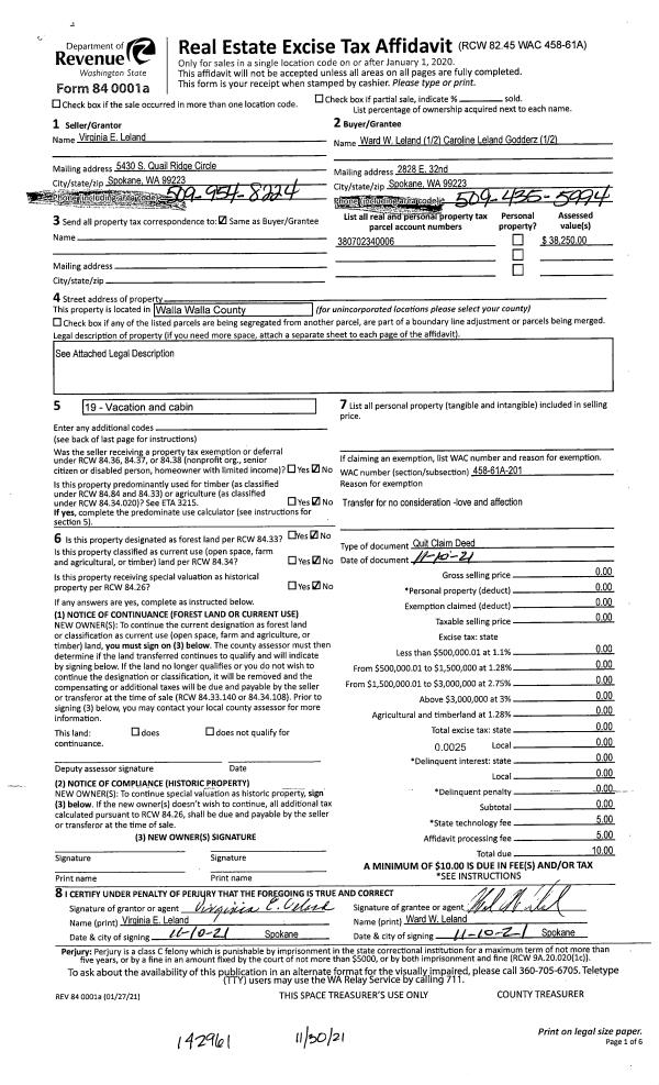 | 2 | 11/30/2021 | QCD | QUIT CLAIM DEED | LELAND ROY M & VIRGINIA E | LELAND VIRGINIA E | | | $0.00 | 142960 | 2021-14129 |