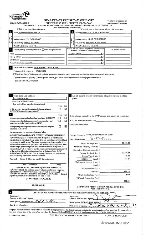 | 1 | 08/12/2016 | SWD | STATUTORY WARRANTY DEED | MARTIN RON & SUSAN | BURLINGAME MICHAEL R & JANIE K | | | $32,500.00 | 130819 | 2016-06421 |