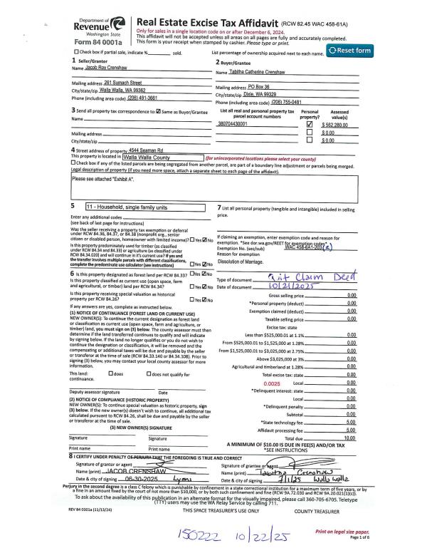| 1 | 10/22/2025 | QCD | QUIT CLAIM DEED | CRENSHAW JAKE & TABITHA | CRENSHAW TABITHA | | | | 150222 | 2025-06517 |