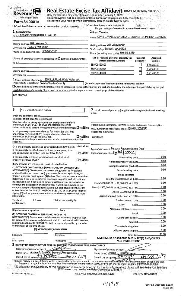 | 1 | 06/04/2021 | DPR | DEED OF PERSONAL REPRESENTATIVE | WALLIS BARBARA L ESTATE | WALLIS KEVIN L ET AL | | 2 PARCELS | $0.00 | 141718 | 2021-06803 |