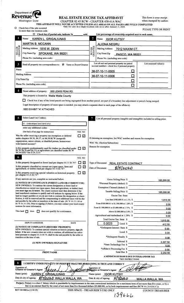 | 1 | 08/05/2020 | REAL ESTAT | REAL ESTATE CONTRACT | GRIGALIUNAS KAREN L | KUTSIY IGOR & ALIONA NEGRU | | 2-PARCLES | $165,000.00 | 139666 | 2020-07738 |