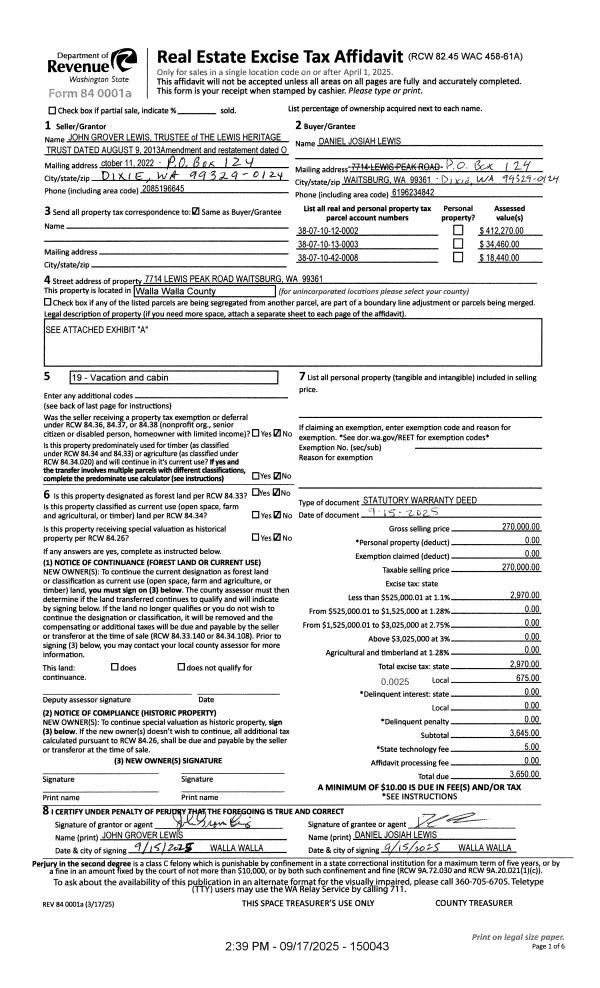 | 1 | 09/15/2025 | SWD | STATUTORY WARRANTY DEED | LEWIS HERITAGE TRUST | LEWIS DANIEL JOSIAH | | 3-PARCELS | $270,000.00 | 150043 | 2025-05656 |