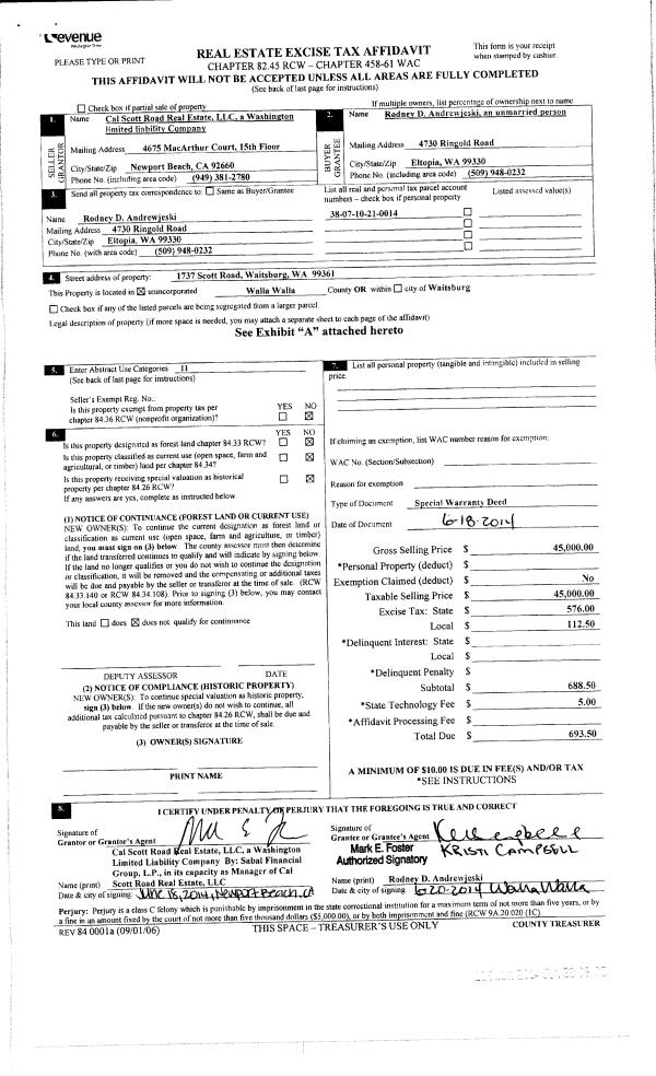| 1 | 06/23/2014 | SWP | Special Warranty Deed | CAL SCOTT ROAD REAL ESTATE LLC | ANDREWJESKI RODNEY D | 2-PARCELS | | $45,000.00 | 126111 | 2014-04279 |