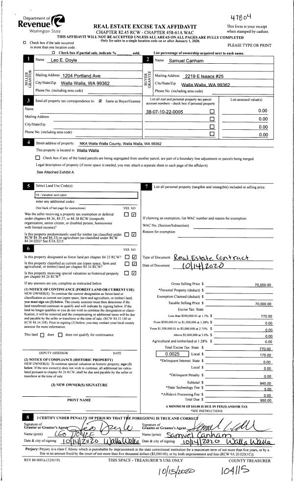 | 1 | 10/15/2020 | REAL ESTAT | REAL ESTATE CONTRACT | DOYLE LEO E | CANHAM SAMUEL | | | $70,000.00 | 140115 | 2020-10686 |