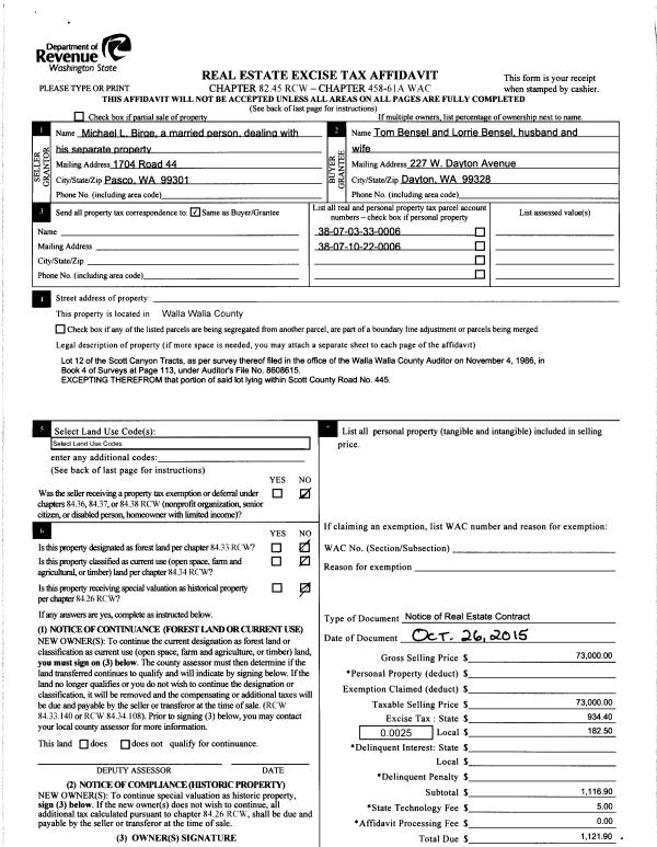 | 4 | 11/13/2015 | REAL ESTAT | REAL ESTATE CONTRACT | BIRGE MICHAEL L | BENSEL TOM & LORRIE | | 2-PARCELS | $73,000.00 | 129189 | 2015-09889 |