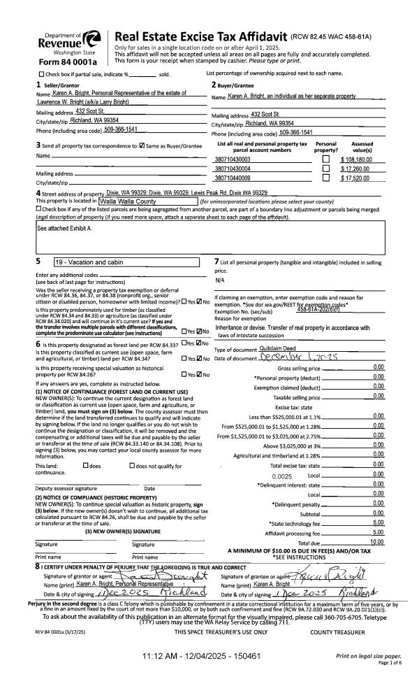 | 1 | 12/04/2025 | QCD | QUIT CLAIM DEED | BRIGHT LARRY | BRIGHT KAREN A | | | | 150461 | 2025-07447 |