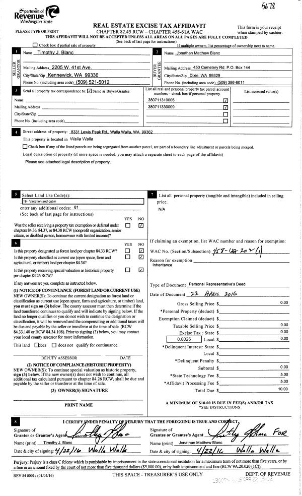 | 2 | 04/22/2016 | DPR | DEED OF PERSONAL REPRESENTATIVE | BLANC MARCEL C & G GAYE | BLANC JONATHAN MATTHEW | | | | 130079 | 2016-03005 |