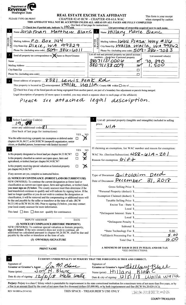 | 1 | 12/31/2018 | QCD | QUIT CLAIM DEED | BLANC JONATHAN MATTHEW | BLANC HILLARY MARIE | | | $0.00 | 136194 | 2018-10765 |
