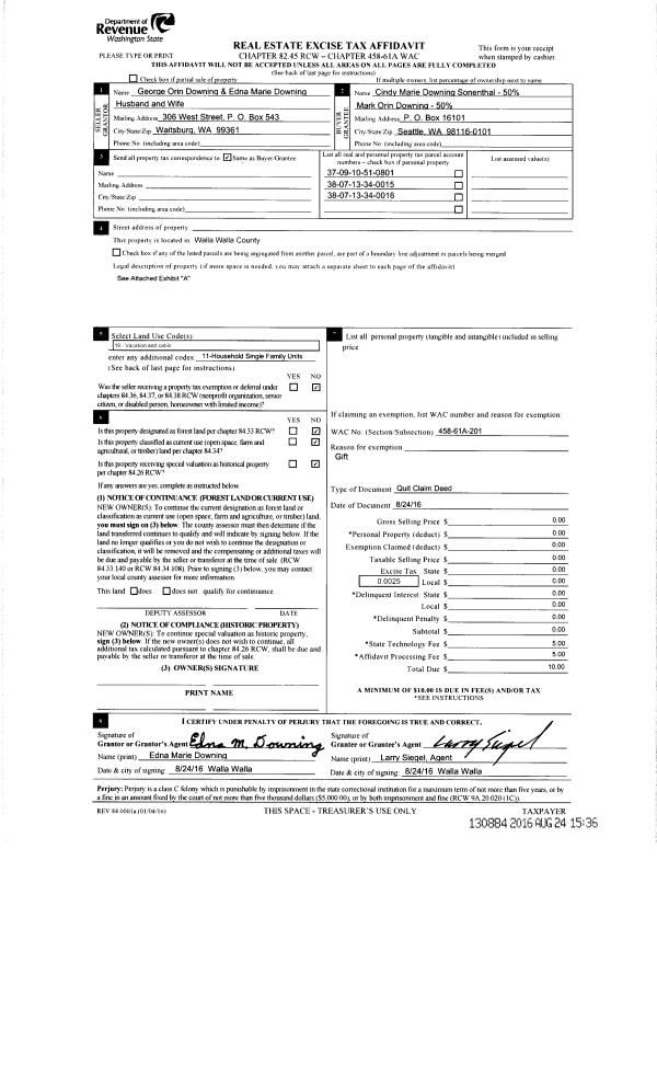 | 4 | 08/24/2016 | QCD | QUIT CLAIM DEED | DOWNING GEORGE O | SONENTHAL CINDY MARIE DOWNING | | | $0.00 | 130884 | 2016-06797 |