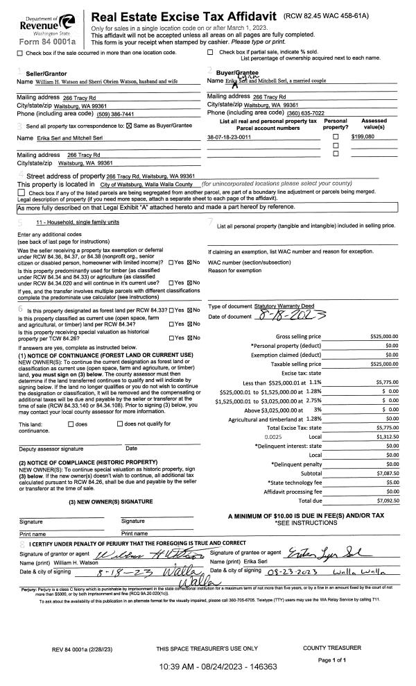 | 1 | 08/24/2023 | SWD | STATUTORY WARRANTY DEED | WATSON WILLIAM H | SERL ERIKA LYNN & MITCHELL | | | $525,000.00 | 146363 | 2023-04906 |