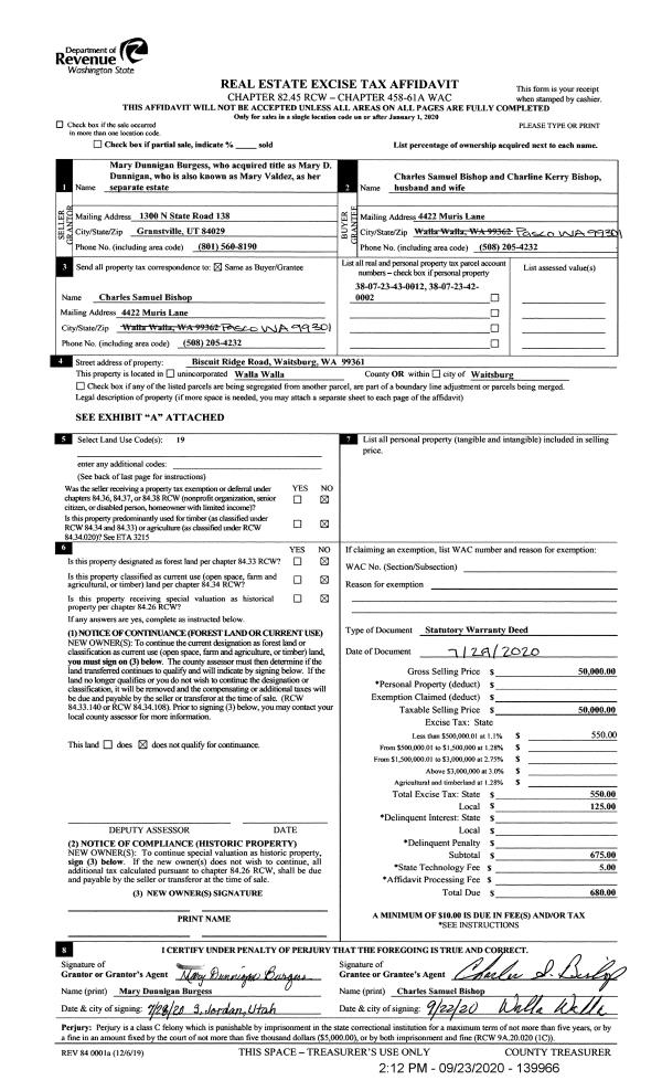 | 2 | 09/23/2020 | SWD | STATUTORY WARRANTY DEED | BURGESS MARY DUNNIGAN | BISHOP CHARLES SAMUEL & CHARLENE KERRY | | 2-PARCLES | $50,000.00 | 139966 | 2020-09744 |