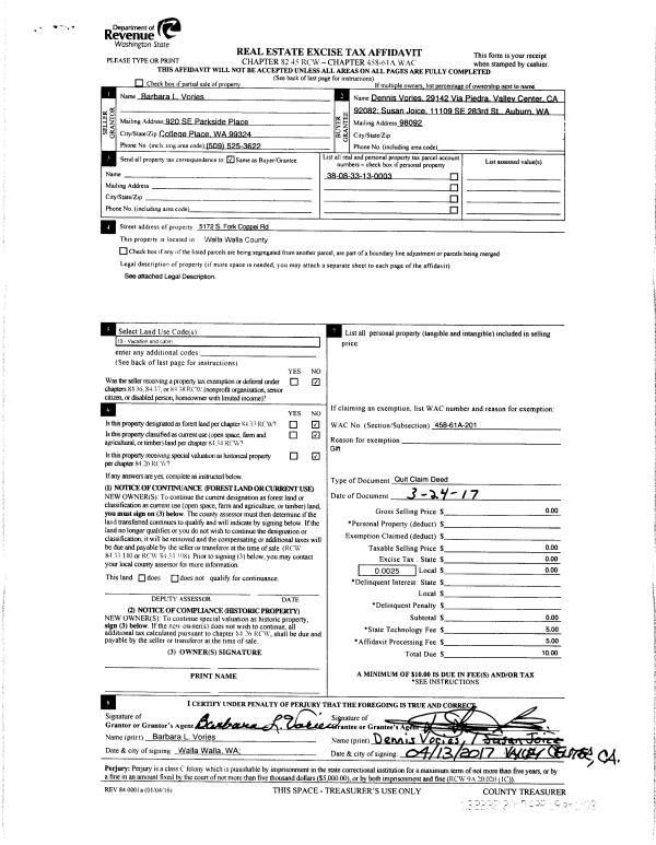 | 3 | 03/24/2017 | QCD | QUIT CLAIM DEED | VORIES BARBARA L ESTATE OF | VORIES DENNIS L | | | $0.00 | 132232 | 2017-02951 |
