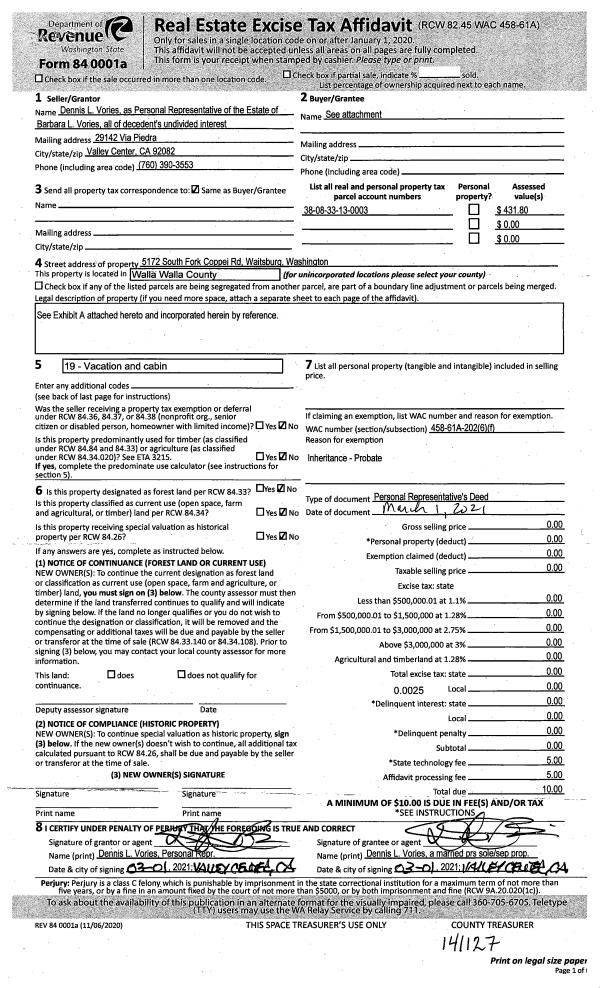 | 1 | 03/01/2021 | DPR | DEED OF PERSONAL REPRESENTATIVE | VORIES DENNIS L ET AL | VORIES DENNIS L ET AL | | | $0.00 | 141127 | 2021-03069 |