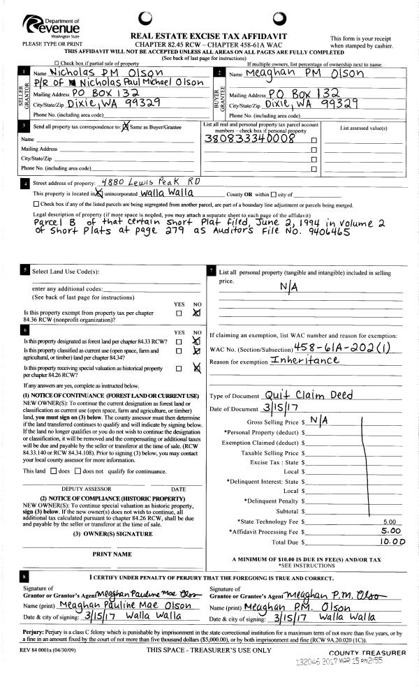 | 2 | 03/15/2017 | QCD | QUIT CLAIM DEED | OLSON NICHOLAS P M | OLSON MEAGHAN PM | | | $0.00 | 132046 | 2017-01996 |