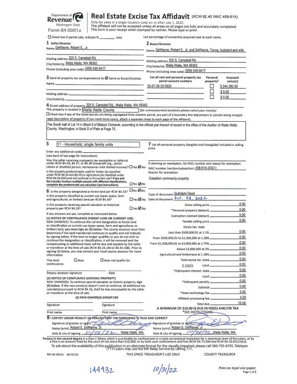 | 1 | 10/28/2022 | QCD | QUIT CLAIM DEED | DE WAYNE ROBERT E JR | DEWAYNE ROBERT E JR & TONYA | | | $0.00 | 144932 | 2022-08798 |