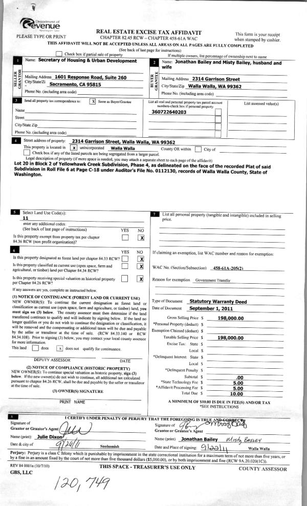 | 2 | 09/27/2011 | WARRANTY D | WARRANTY DEED | SECRETARY OF HOUSING & URBAN D | BAILEY, JONATHAN & MISTY | | | $198,000.00 | 120749 | 2011-07530 |