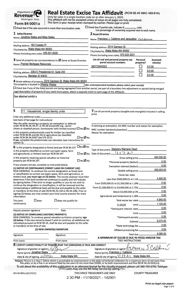 | 1 | 11/18/2021 | SWD | STATUTORY WARRANTY DEED | BAILEY JONATHAN & MISTY | CALDERON FRANCISCO J & JACQUELINE | | | $450,000.00 | 142901 | 2021-13748 |